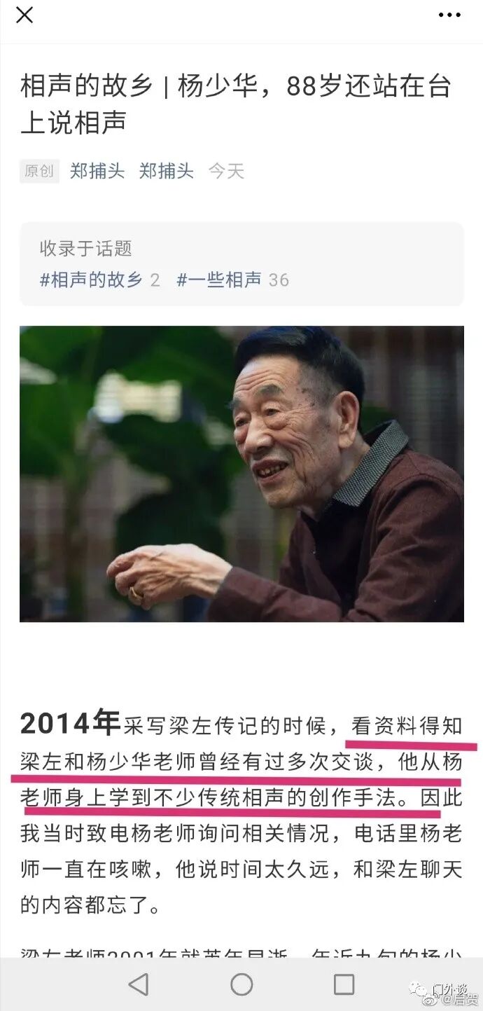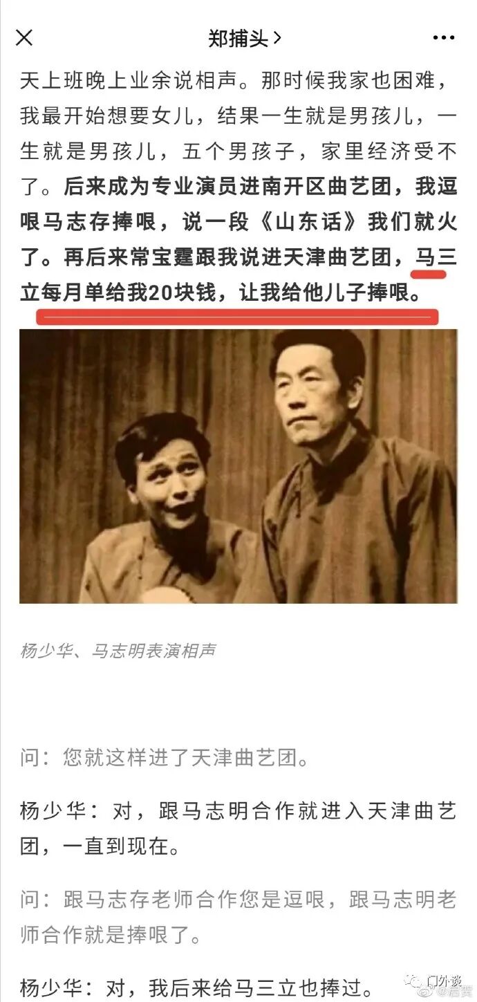 自从赵伟洲、杨少华说的《枯木开花》以后,赵伟洲没多红,杨少华倒是一夜之间炙手可热。如今杨少华以惊人的岁数,顽强的体格,占据了脑残相声迷们心中“大师”的位置。至于杨少华到底在台上有什么本领,且不说非要给马三立用“哑语”捧哏的《开粥厂》