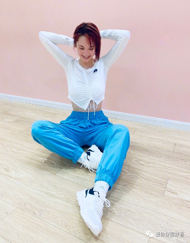 这次穿着一套黑白look出镜,虽说是简约配色,却又很有魅力。黑色上衣款式别致,短款炫腹装还在衣摆部分加入系带点缀,把腰型衬托得越发纤细,没有一丝赘肉,让女孩都自闭了;白色休闲裤低调朴素,丝毫不抢镜,展现出美好腰线。