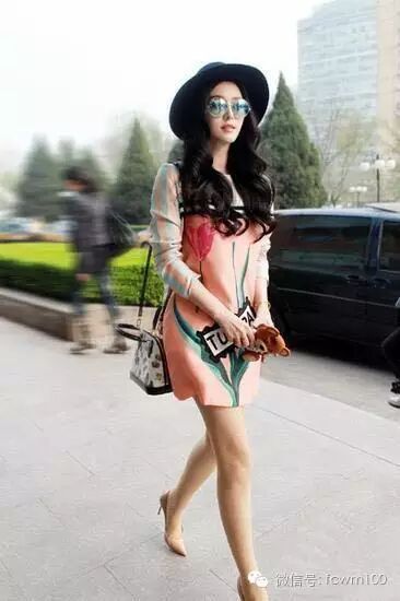 范冰冰也是微胖女神,基本露肩就露馅,所以长袖粉嫩连衣裙遮住手臂和大腿的肉,裸色高跟加长腿的长度,高挑有气质。