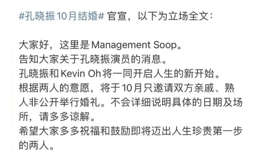 然而在去年,孔晓振通过经纪公司,官宣了自己和美籍韩裔歌手kevin oh结婚的消息。