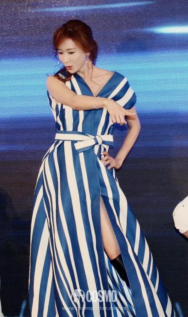 小S的挖洞造型就清爽多了,蓝色条纹衬衫搭配白色高腰短裤,又是一套适合日常演绎的造型,实用系数很高。