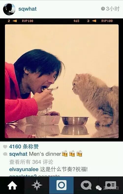 她上传了一张冯德伦与爱猫MayMayBoy对望吃饭的照片,更写下“Men’sdinner”。