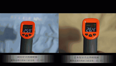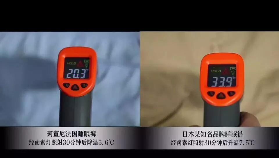 对比日本某知名品牌睡眠裤,在相同环境用卤素灯照射30分钟后,珂宣尼睡眠裤降低了5.6°C,简直是行走的变频空调啊!