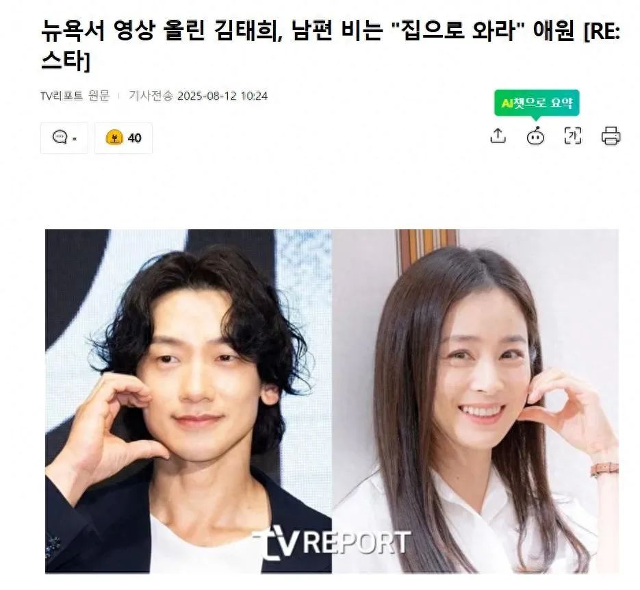 时隔两年,韩国“国民女神”金泰希突然在社交平台晒出一段纽约夜景视频,瞬间引爆网络。更让粉丝尖叫的是,丈夫Rain(郑智薰)火速留言互动,一句“来我们家吧”直接甜上热搜,网友直呼:“这对夫妻的糖分超标了!”