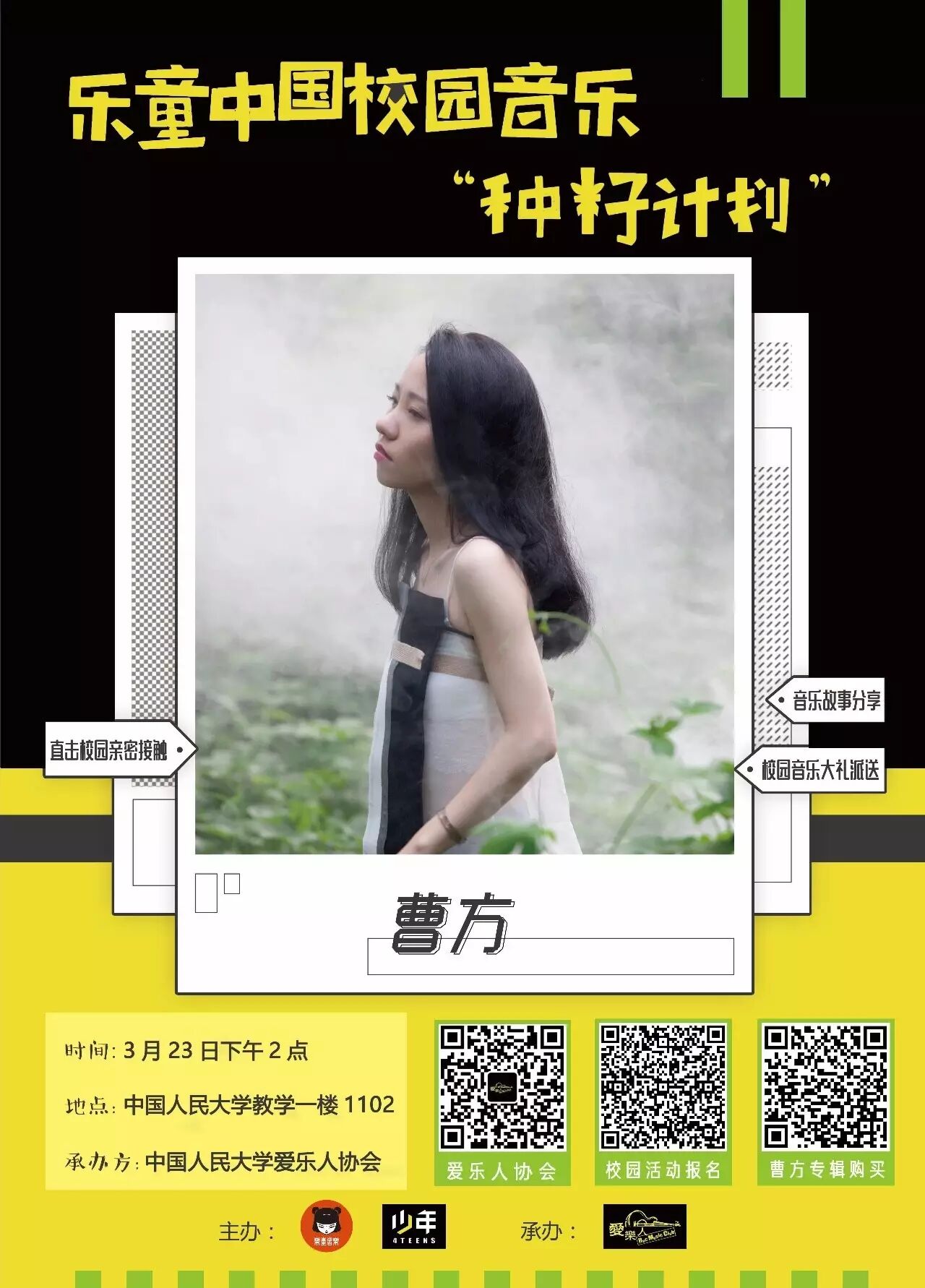曹方来了你接好! 爱乐人协会 港台女星 2016-03-21 21:57:10 311 创作不易,用心坚持,欢迎请BaGua喝几杯爱心咖啡!打赏并支持本文 打赏并删除本文 点击上方“爱乐人协会” 可以订阅哦!曹方要来了!3月23日,也就是本周三下午两点,就在教一1102,女神曹方要来了!曹班长是如此才华纵横:2000年,曹班就凭其创作的第一支歌曲《夕阳情歌》参加“兴网首届全国高校原创音乐大赛”荣获最佳组合及最佳作词提名;2003年9月,曹方发布自己的第一张专辑《黑色香水》,被评为内地年度十大唱片;2005年12月发布第二张专辑《遇见我》,获得“内地年度最佳唱片”奖,专辑同名主打歌曲《遇见我》也获得“内地年度金曲”奖 ;2008年4月,《比天空还远》先后在“第八届音乐风云榜”和“MusicRadio中国TOP排行榜”颁奖典礼上获得了“最佳作曲”和“最佳唱作人”和“内地推荐唱片”三项殊荣 ;2012年曹方推出个人APP专辑《浅彩虹》,这也是中国大陆第一张APP音乐专辑;2014年10月加盟“红星音乐20年致敬合辑”。干净的声音,不复杂的感情,清清浅浅却能到人心底。至少elder爱乐人们听到此人要来都高呼女神,不知你们是不是也已经开始心跳加速了?此次爱乐人和乐童中国校园音乐种籽计划“校园音乐分享会”合作,在人民大学举办曹方专场沙龙讲座,曹方带着新专辑《wanderlust·流浪癖》,带着她唱游全国六十所高校的心愿,来和大家见面了!这次大家可以和曹方面对面交谈,亲耳听听曹班讲述的她的故事~偷偷告诉你,还有现场福利哦~不要着急,还有报名的机会!猛戳阅读原文链接就可以报名啦~周三下午两点凭短信入场哦~告诉大家一个福利——周三现场有机会得到曹方亲笔签名的新专辑《wanderlust·流浪癖》哦!机不可失!时不再来!快来报名吧~爱乐人和曹班长在教一1102等着你!Sing For The Moment!我们的公众帐号:人人个人主页:爱乐人人人社团人:人大爱乐人协会微信公众号:爱乐人协会新浪微博:爱乐人ruc吉他角每周五晚9:00~大家肚子饿教二草坪东北角欢迎你的加入~微信号: 创作不易,用心坚持,欢迎请BaGua喝几杯爱心咖啡!打赏并支持本文 打赏并删除本文 感谢您的支持鼓励,我会继续努力的!文章地址:用户邮箱:打赏金额:USDT 请输入数字点击”去打赏“,即可进行打赏支持本文章哦 曹方 About the Author 爱乐人协会 功能介绍:发布爱乐人最新的活动,分享好听的音乐,分享实用的吉他教学视频、吉他谱.和主页菌互动、咨询各种细节•••••• Related Posts 曹方来了你接好! 2016-03-21 21:57:10 张雨生专辑《口是心非》——华语流行乐的巅峰 2016-03-17 23:10:02 发表评论