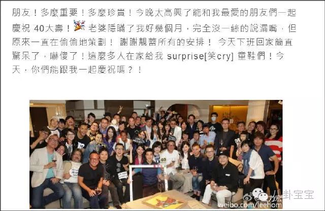 老王开心在社交网络写道:“朋友!多么重要!多么珍贵!今晚太高兴了,能和我最爱的朋友们一起庆祝40大寿!老婆隐瞒了我好几个月,完全没一丝的说漏嘴,但原来一直在偷偷地策划!谢谢靓蕾所有的安排!今天下班回家简直惊呆了,吓傻了!这么多人在家给我surprise(惊喜)。”