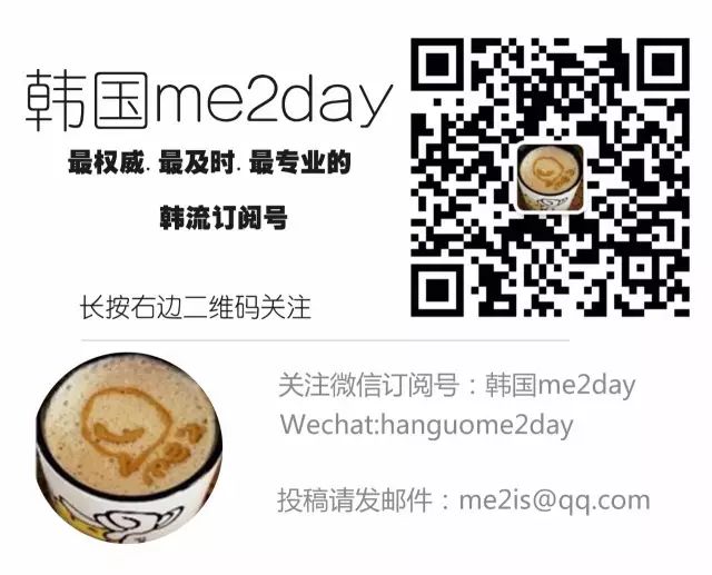△如果喜欢这篇文章欢迎分享到朋友圈。这里是韩国me2day的公众号关注请长按下方二维码图片识别或添加微信号hanguome2day,即可订阅最权威·最及时·最专业的韩流信息。