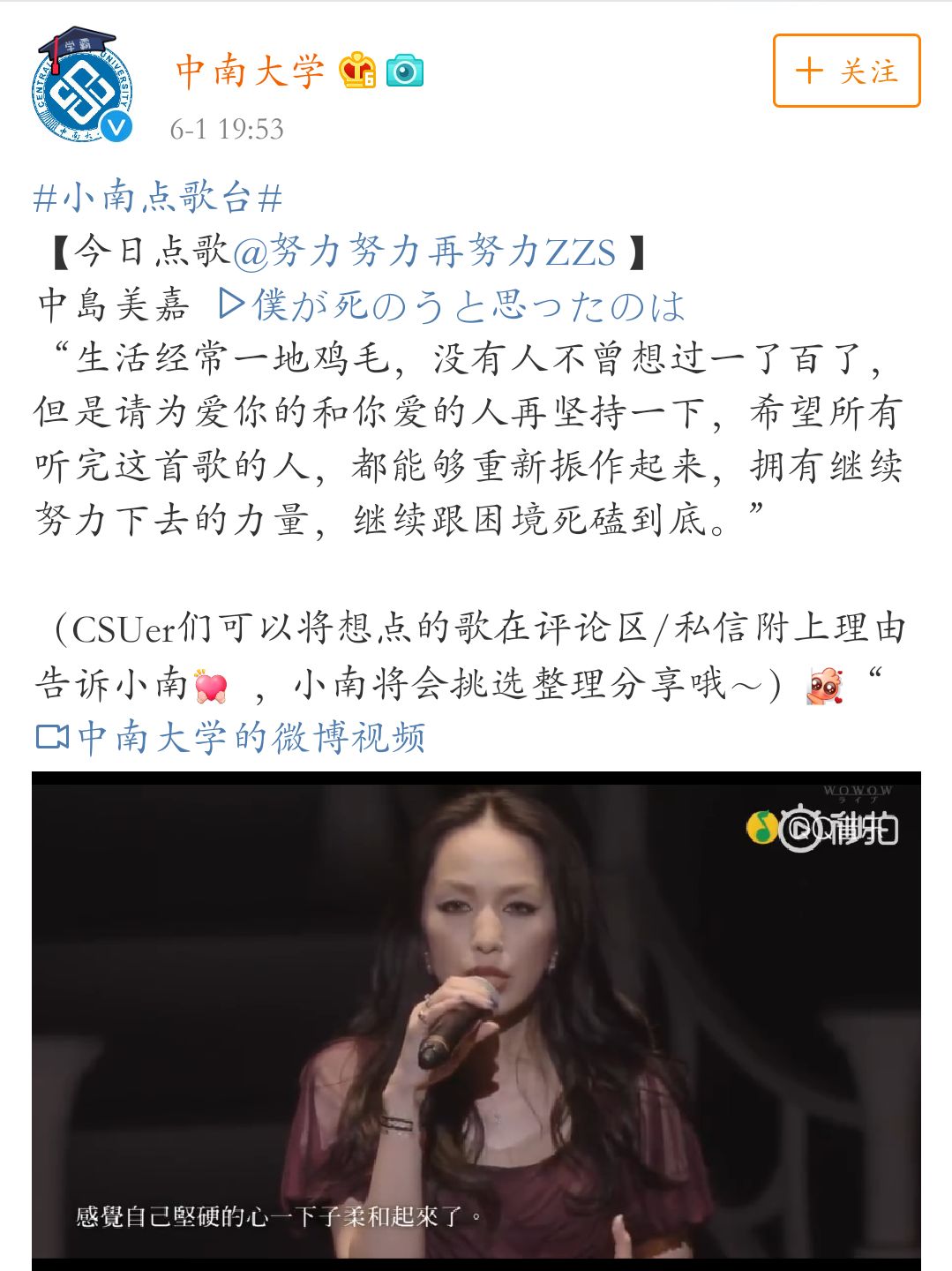 6.1儿童节这天,中南大学的官微推送了一条中岛美嘉的mv。