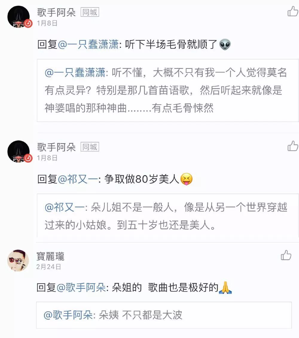 与世隔绝几年,她重新学着直播、发微博、和粉丝互动。决心以一己之力复兴少数民族文化,她还亲自潜入自己专辑评论里“激情刷屏”对网友的留言一一回复,意外地竟有点萌。
