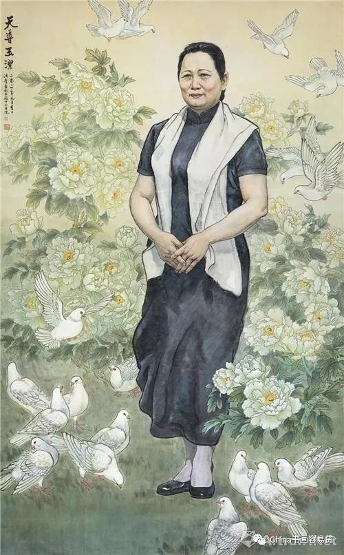 他的人物画创作得益于对传统线描的严格训练和继承,更是扎实素描基本功的惟妙惟肖的艺术典型的再现和创新。一幅名为《天香玉洁》的主题画创作足以说明画家沟通古今艺术真谛和驾驭构思章法、刻画形象、随类附彩的能力。通观此作,宋庆龄女士慈样高贵、雍容大度,终生追求和平,为祖国民族独立民主富强、人民幸福坚持奋斗的形象跃然纸上,特别是对手部准确、细致入微的描绘,较好地传达了她的从容、慈爱、海纳百川的浩瀚精神世界。背果和平鸽千姿百态的布局,白牡丹疏密相间的处理,无一不衬托出典型坏境下典型人物的普世价值和思想追求,充分展现了“蓓蕾抽开素练囊,琼葩薰出白龙香。裁分楚女朝云片,剪破姮娥夜月光”的高雅洁净的诗情画意。