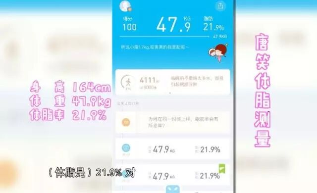 李珈贤老师也说到:长寿的人体脂率都在20%以下,一般女性的体脂率应该在20%~25%就可以,体脂率达到21%就是完美的身材了。我们的辣妈唐笑在节目中就测了体脂率,让人羡慕的21.9%,果然是货真价实的好身材。