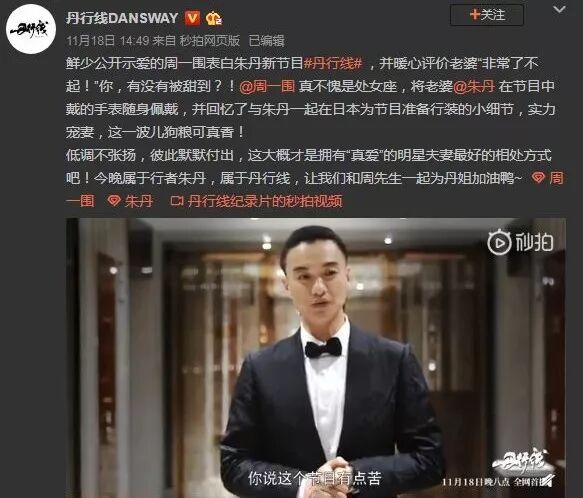 像朱丹,作为周一围头号迷妹的她经常会为周一围宣传,字里行间都能感受到妻子对于丈夫的那种崇拜和支持。