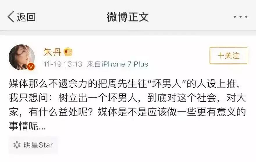 不过作为周一围头号迷妹兼老婆的朱丹,反倒是非常爽快地发微博力挺老公周一围不是“坏男人”。
