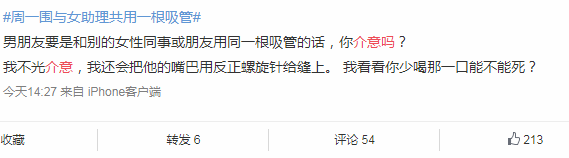 其实这件事说大不大说小不小,只是周一围这种已婚男性与异性朋友共用一根吸管的“不避嫌”的行为,让很多人都蛮吃惊的。