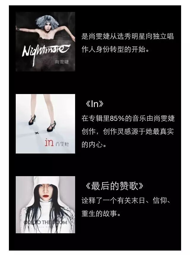 2011年的《Nightmare魔》、《In》给人们带来了真正的尚雯婕。也是从《In》开始,尚雯婕自己开始担任专辑制作人。2012年8月,双张的《ODE TO THE DOOM最后的赞歌》发行,得到了许多乐评人的2012十大华语专辑的评价。