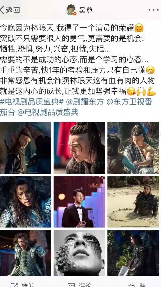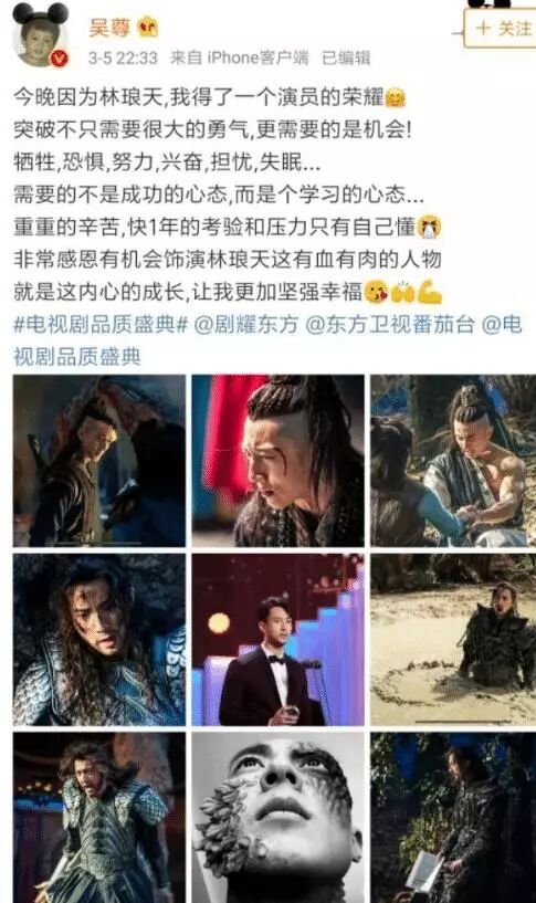 3月6日晚,吴尊在微博发布关于新角色的感言,称:今晚因为林琅天,我得了一个演员的荣耀,突破不只需要很大的勇气,更需要的是机会!言辞恳切,让我们看到了一个演员的认真。