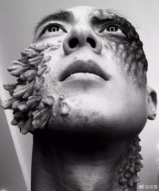 当看到第八张配图的时候,照片中的吴尊五官没变,但脸的两侧以及脖子却长满了类似龙触角的东西,相当可怕。这是吴尊为电视剧所作的特效妆。