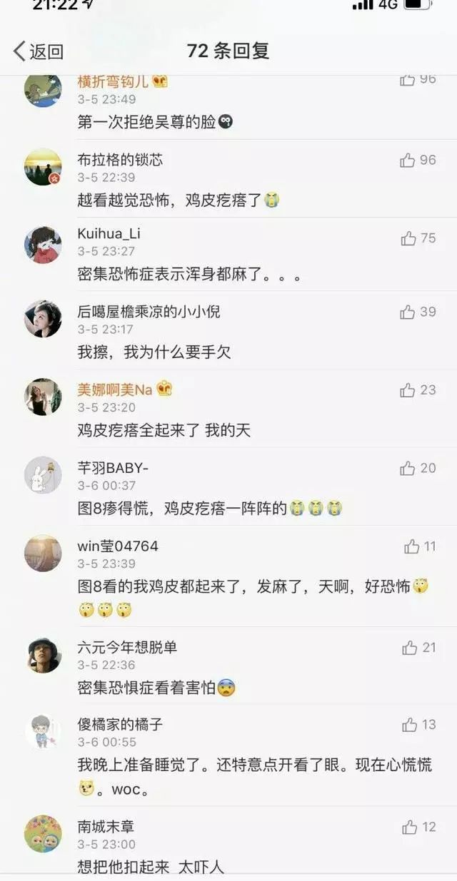 网友纷纷表示”感觉整个人都不好了”,”太刺激了,原谅我不敢放大第八张图”,”全身都起鸡皮疙瘩了”,”头皮发麻”……