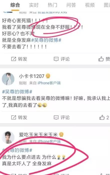 网友们对这张配图一直在讨论,甚至让”吴尊微博”上了热搜榜。大家纷纷感到好奇,于是又有更多的人点进了吴尊的微博,点开之后百分之九十的网友都怪自己点开了这条微博。