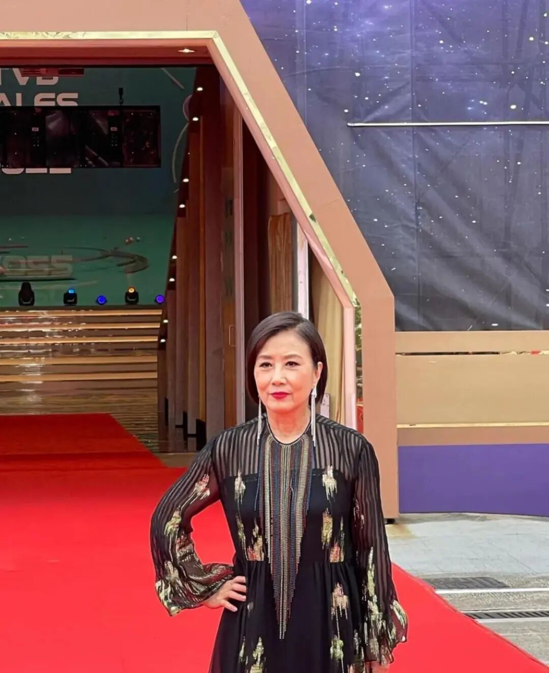 汪明荃留超过耳朵的利落短发,穿黑金相间轻纱长裙,叉腰站在红毯上,气质很足,这身衣服和她的气势很搭,耳朵上的长长饰品作为吊坠也很亮眼,70岁了精神头十足,衰老的很真实!
