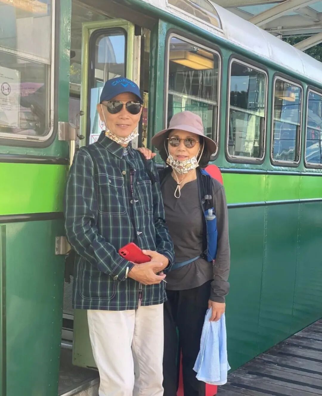汪明荃在私下是一个很随和的蓝色,靠在老公怀里,头戴黑色皮质帽子,穿黑灰条纹相间大衣,搭配白色裙子,戴着墨镜也难掩她的气质,看照片就可以看得出两个人都很幸福。