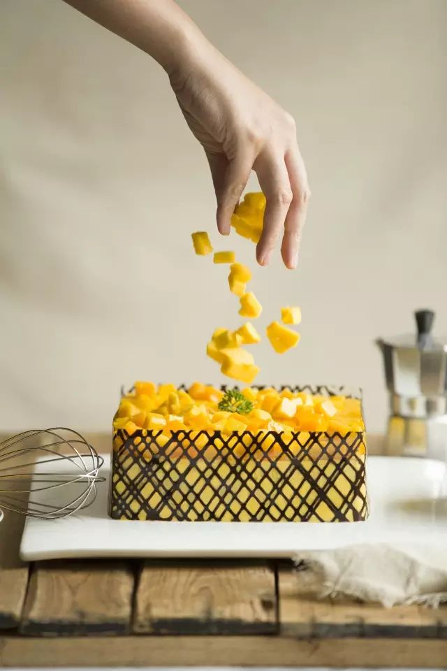 清甜的芒果慕斯加原味蛋糕夹层,表面还铺满了金灿灿的新鲜芒果,诱人的芒果香气扑鼻而来。