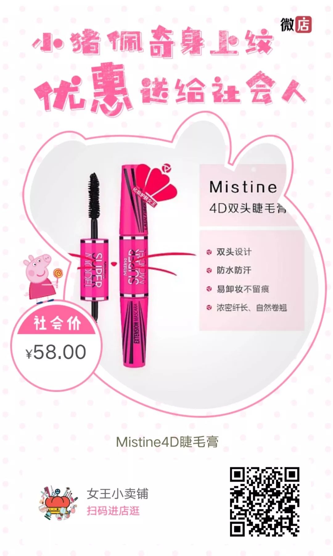 泰国Mistine 4D双头睫毛膏这是一款网红睫毛膏,连美妆大神Pony 都推荐的产品,这个睫毛膏炒鸡好用,哪怕你的睫毛短道素颜无法看见,用过之后也会显得浓密纤长,效果超赞而且好卸妆,是一个性价比很高的宝贝哦~