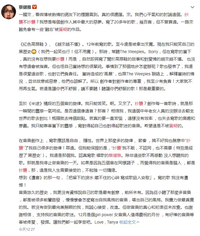 21日,蔡健雅新歌被疑抄袭泰勒·斯威夫特。她发长文回应此事,称:“我能保证的是,‘抄袭’我不敢,不认同,也不需要。”“我只能靠着当下的灵感,写对得起自己也对得起歌迷的音乐。”并自侃自己是“中年老女人”,没法翻全世界的歌对比。