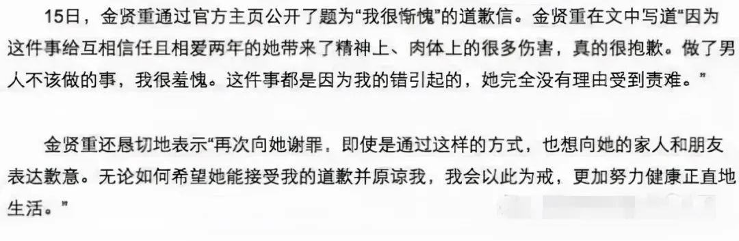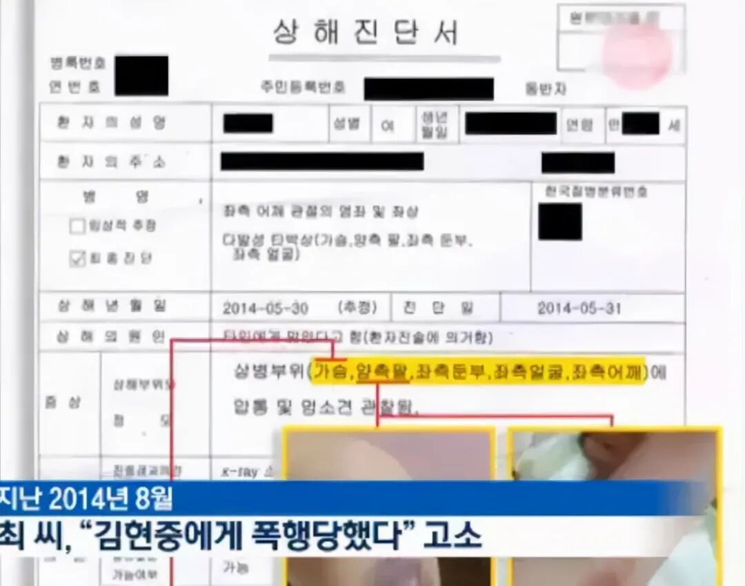 但是在2014年,金贤重遭遇了巨大冲击。前女友突然向警方起诉,称遭到金贤重多次殴打,同时曝光了自己的诊断书和伤处照片,随后金贤重于接受警方调查,并发布了道歉信。