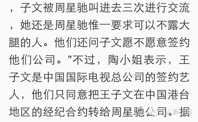 王子文当时的经纪人对媒体说起选角经过,说她被星爷三次叫去交谈,还是唯一要求可以不露大腿的人(这是什么鬼......)。但王子文因为合约问题,无法签约到周星驰公司。