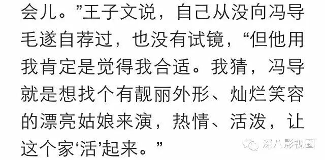 王子文对媒体否认自己上冯小刚的戏,是靠王朔的关系。同时,她却说自己连试镜都不用就被选上了。