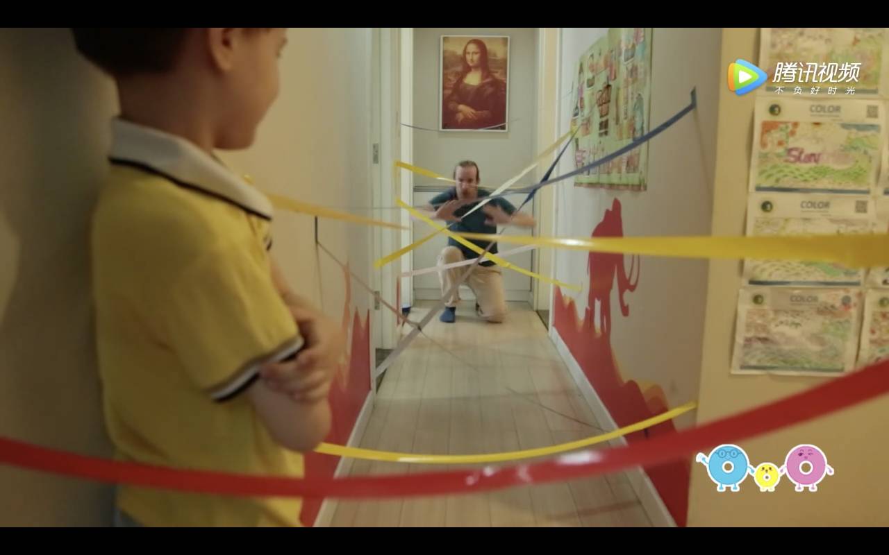 首先,准备一卷或者几卷色彩鲜艳的胶带。在你家里的走廊把这些胶带粘贴成一个稍微有点难度的“机关”(注意胶带可能会在墙上留下痕迹)。如果家里没有走廊,也可以把椅子和桌子组合一下,再把胶带粘在它们的腿上。当然,你也可以带着孩子到大自然里去玩这个游戏,把胶带粘在树上就可以了!一起合作粘贴胶带的这个过程,能够很好的锻炼孩子的动手能力和合作意识。