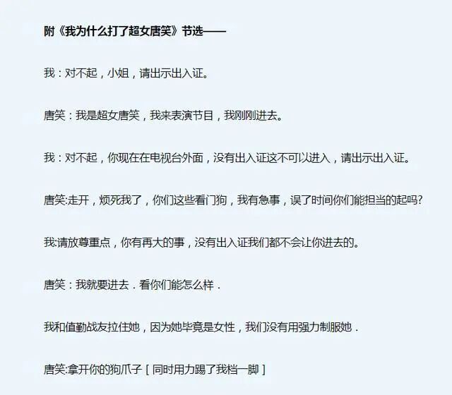 不得不说,唐笑情急之下作出的举动,确实有点过分。作为工作人员的武警程帅,出于工作需要,也顺带手将唐笑推了一把。按照唐笑自己的说辞,自己当时被武警甩了两巴掌。