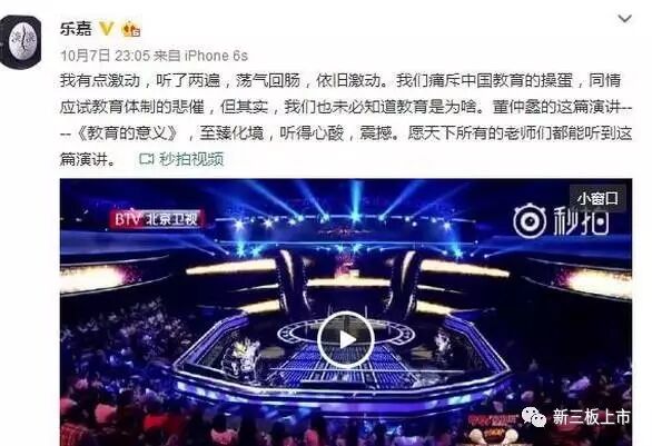 乐嘉发微博说:“我有点激动,听了两遍,荡气回肠,依旧激动。我们痛斥中国教育的操蛋,同情应试教育体制的悲催,但其实,我们也未必知道教育是为啥。董仲蠡的这篇演讲----《教育的意义》,至臻化境,听得心酸,震撼。愿天下所有的老师们都能听到这篇演讲。”