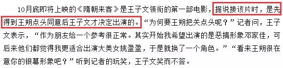 2009年10月,王子文第一部主演电影《隋朝来客》上映,据说接该片时,是先得到王朔点头同意后王子文才决定出演的。