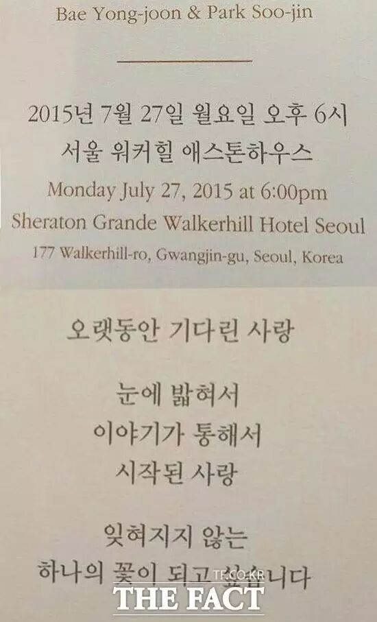 婚讯公布后,一直被外界怀疑是否是“急补票”,但个性低调的裴勇俊对于怀孕传闻不断否认。如今喜帖曝光,会场就订在当年拍《情定大饭店》的场景——首尔华克山庄喜来登酒店。因是非公开婚宴,让这场“世纪婚礼”更受瞩目。