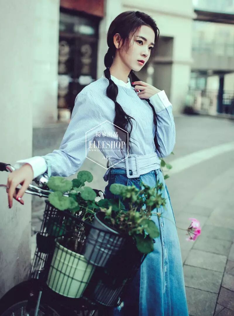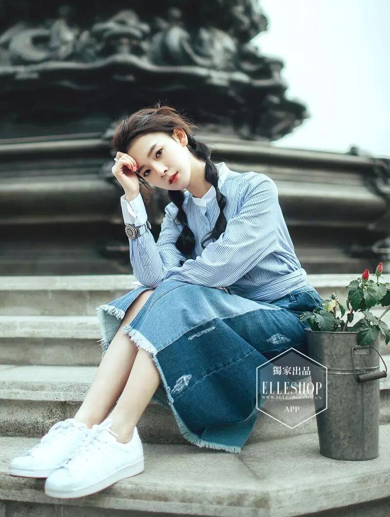 搭配解析:长了一张“初恋脸”的陈瑶又怎么能错过校园女神风,越简单的条纹衬衫反而越能衬出陈瑶清新的气质,搭配牛仔裙勾勒出少女的美好身形,小白鞋则作为点睛之笔为造型划下一个完美的句点。