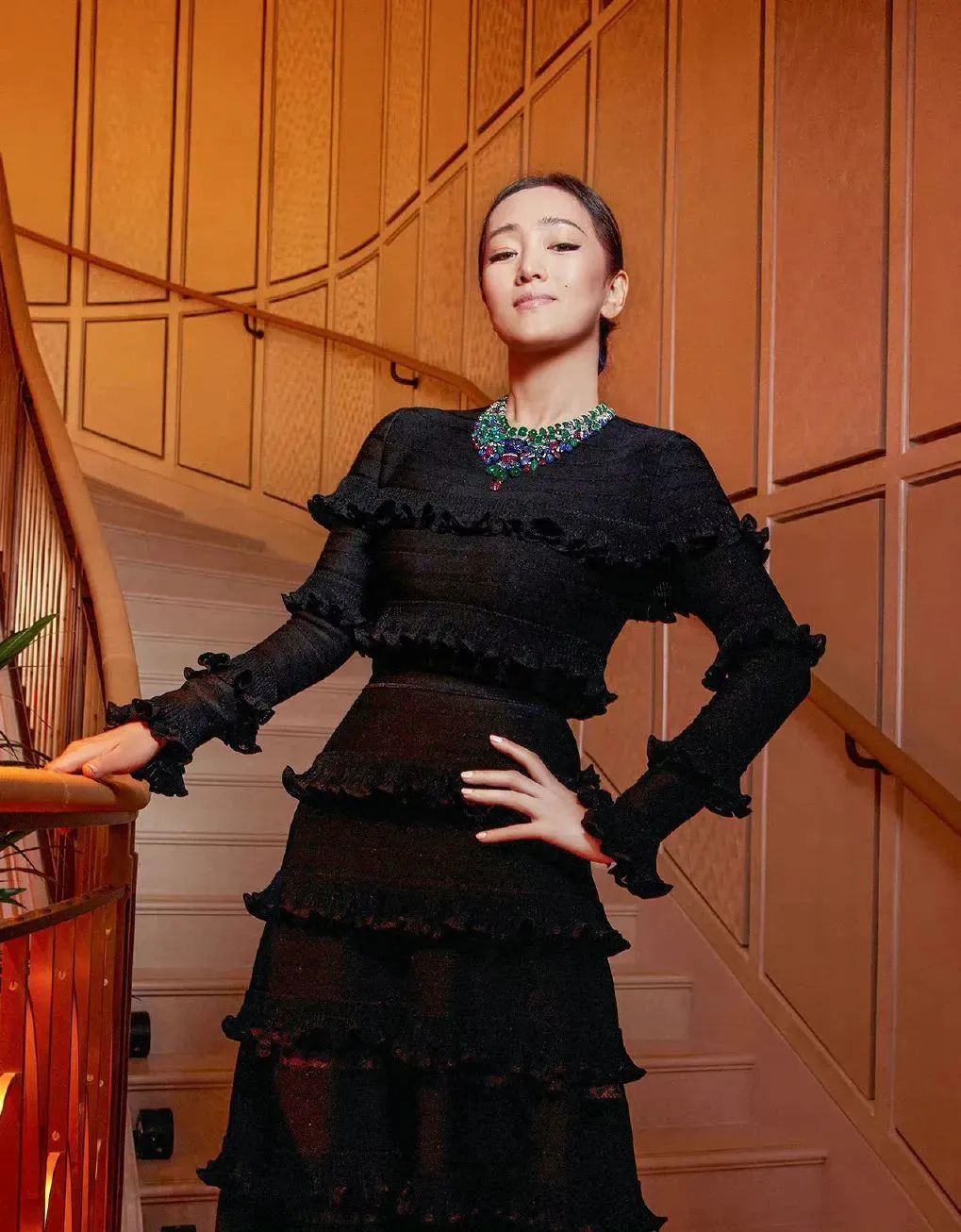 ▲其实右边这条荷叶边黑色礼服有点土,她硬是靠自己的气势穿出了华丽感。