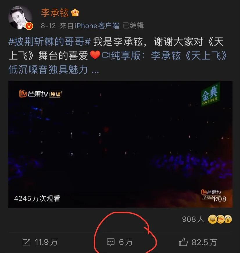 再来看看李承铉的人气,最新的一篇微博转发了《天上飞》的舞台,留言已经有六万了。