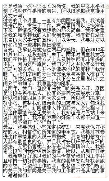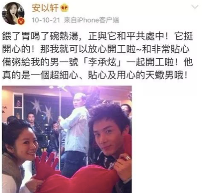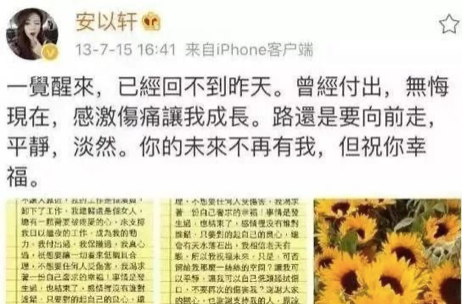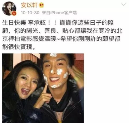 Anyway,为了保护戚薇,李承铉发了一篇文章,承认了自己和安以轩的恋情,但是他说这段感情在2012年11月14日就结束了,两人交往两年,是和平分手,不存在劈腿,也没有别人的介入,完全是两人走不下去了。