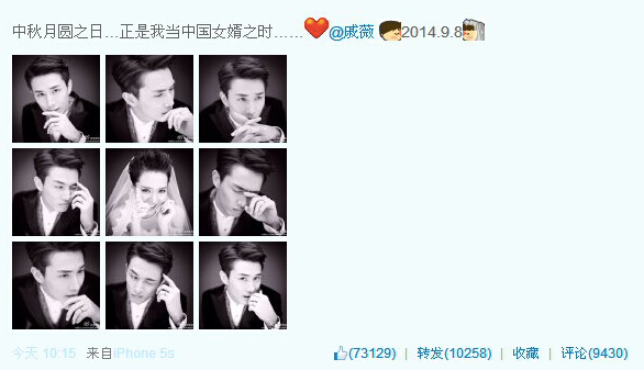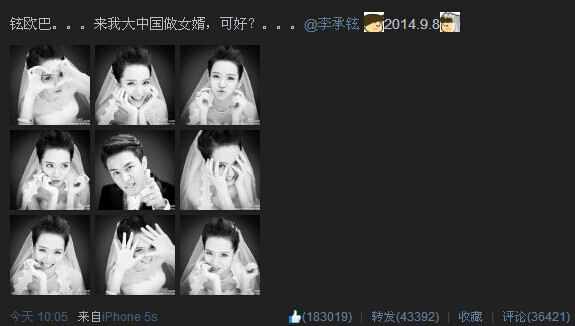 8月25日,戚薇在微博发文晒婚纱照,还预告了结婚日期,李承铉也在微博回应,够甜的。