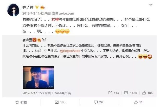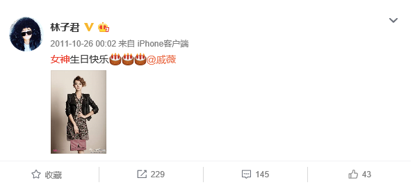 这个确实,林子君的微博上2011年就有了给戚薇的生日祝福,这个祝福不仅掐着时间送的,还略有粉红泡泡,林子君大方地叫她“女神”。