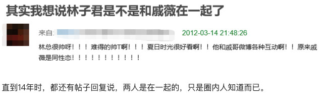 2012年的时候呢,就有人在豆瓣发帖,说觉得林子君好像和戚薇在一起了,起因是俩人的微博互动很频繁。