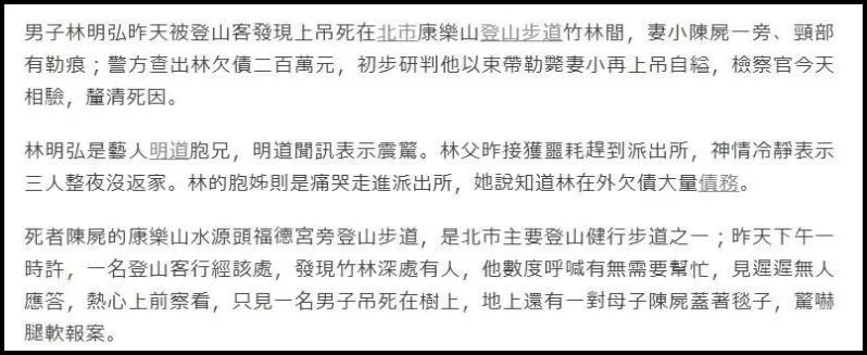 经警方后来查证,死者中的成年男性正是台湾著名男演员明道的亲哥哥,林明弘!