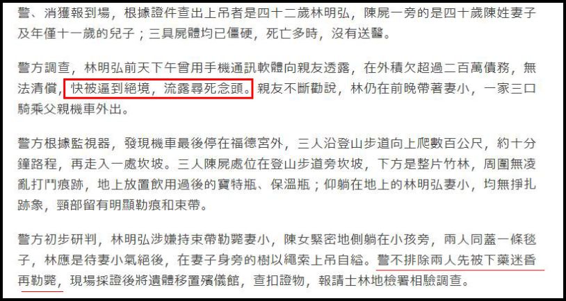 根据警方判断,他先是将老婆以及不满12岁的儿子迷昏后,再残忍勒死,最后再自杀。
