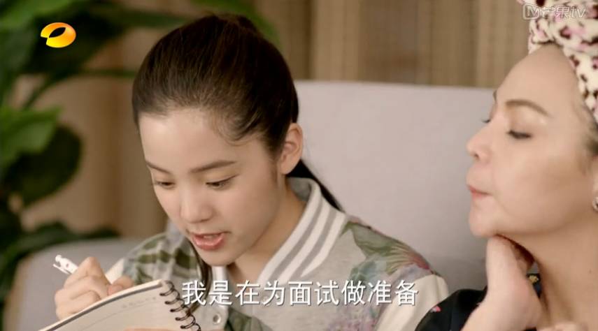 在文中,出现频率最高的就是欧阳娜娜拿着笔记录、写写画画的镜头。室友在保(da)养(guang)脸(gao)的时候,她在准备面试题目。