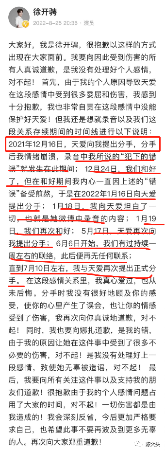 被张天爱和古力娜扎锤爆,徐开骋不算“出轨”,小作文写的不错! 陈大头 内地女星 2022-08-25 23:23:04 494 创作不易,用心坚持,欢迎请BaGua喝几杯爱心咖啡!打赏并支持本文 打赏并删除本文 今天,娱乐圈最火爆的莫过于张天爱和古力娜扎锤爆徐开骋。说起徐开骋,可能很多人不太清楚,代表作也没什么,就是《国子监来了个女弟子》、《斛珠夫人》和《警察荣耀》。另外两位女主角,大家几乎都认识。一个是张天爱。一个是古力娜扎。张天爱和徐开骋在一起很久了。2019年5月,两人合作《我的漂亮朋友》,传出在恋爱。甚至拍到徐开骋去机场送张天爱,日常互动也十分甜蜜。2020年2月,疫情居家期间,两人被发现各种同款。2020年3月,徐开骋被拍到现身张天爱家门口寄快递。2021年5月,徐开骋给张天爱宣传新剧。2022年5月,张天爱参加《浪姐》,徐开骋为张天爱公开打Call。俨然,两人已经悄悄恋爱很久了,只是没有公开。2022年7月份之后,徐开骋被拍到和古力娜扎在一起了。 然后就上了热搜,古力娜扎也成为“小三”。 显然,古力娜扎是不知情的,一脸懵,随着事情的不断发酵,张天爱甩出了一段音频。 说徐开骋是惯犯,在一起不能曝光恋情,还出轨。 古力娜扎转发张天爱的微博,称自己不是三,现在以后多不会是,看清了徐开骋是什么东西。 在两大美女和全网众多网友的声讨下,徐开骋应该是要凉了。当然徐开骋的危机公关还是要做的,他出来道歉了。 徐开骋在里面提到了时间线。 2021年12月16日,张天爱提出将分手,然后自己情绪崩溃,所有酒后乱性。 2021年12月24日,和好,然后自己“内心煎熬”。 2022年1月16日,徐开骋向张天爱提出分手。 2022年1月18日,徐开骋向张天爱坦白,就是张天爱抛出的音频。2022年1月19日,和好。 2022年5月17日,张天爱再次提出分手。 2022年6月6日,有过一周的联系。 2022年7月10日,徐开骋正式向张天爱提出分手。 一看这时间线,徐开骋似乎不算出轨呀,事情在分手期间发生的,分分合合,似乎错怪徐开骋了。 但仔细看徐开骋的道歉,就想笑了,这明显是个海王的做派,内心还有极度的占有欲望,算不上纯情,是滥情。 反复纠缠,分手、和好、分手、和好,这样的感情是不会长久的,和张天爱在一起,花谁的钱多,住哪里?为什么不公布恋情? 刚分手就乱来,自律性极差,说是惯犯一点都不为过。 也许没分手也乱来过,张天爱说他是惯犯一定是有理由的。 被女友甩了之后,就写小作文,道歉,然后装情绪崩溃,确实是演技挺好的。 不停犯错,不停道歉,真的是够了。与张天爱曾三度复合,分手仅20天就与娜扎交往,这样的男人也是很可以的。 伴随着这一事件的曝光,徐开骋的演艺生涯也将彻底告一段落,至于他和古力娜扎合演的剧集《恋恋红尘》,以及《花溪记》、《装腔启示录》(蔡文静合作)、《照亮你》、电影《长空之王》 ,也将或多或少受到影响,甚至会被追究责任。 当然今天最想说的是徐开骋的那段录音,小作文的框架,男同志都学着点。 1、关键词框架:“我好难受”“我喝多了”“酒后乱性”“我恨我自己”“我原谅不了我自己”“我离开不了你”“我知道你不会原谅我了,但是 我爱你” 2、成语排比: “对你情不自禁“对你言不由衷“对你身不由己” 看看这些小作文,普通女人早流泪了。 看到“爱宝、爱宝、爱宝回来吧”这样的小作文,我不得不佩服徐开骋作为渣男是有实力的。 一般人还真学不会。 特别是那个想成为真正的男人,所以去酒后乱性了,把出轨解释的清新脱俗也是牛了。 男人不自爱,就像烂菜叶,这样的渣男不配呆在娱乐圈,丢人! 不过徐开骋还有让人值得学习的地方, 那就是不要脸和小作为写的特别深情,还演技不错,没女朋友的男同志要多学习了。 不然,人家那么多女朋友,你一个都没有呢。 创作不易,用心坚持,欢迎请BaGua喝几杯爱心咖啡!打赏并支持本文 打赏并删除本文 感谢您的支持鼓励,我会继续努力的!文章地址:用户邮箱:打赏金额:USDT 请输入数字点击”去打赏“,即可进行打赏支持本文章哦 古力娜扎 About the Author 陈大头 功能介绍:生活的理想,就是为了理想生活 Related Posts 被张天爱和古力娜扎锤爆,徐开骋不算“出轨”,小作文写的不错! 2022-08-25 23:23:04 发表评论