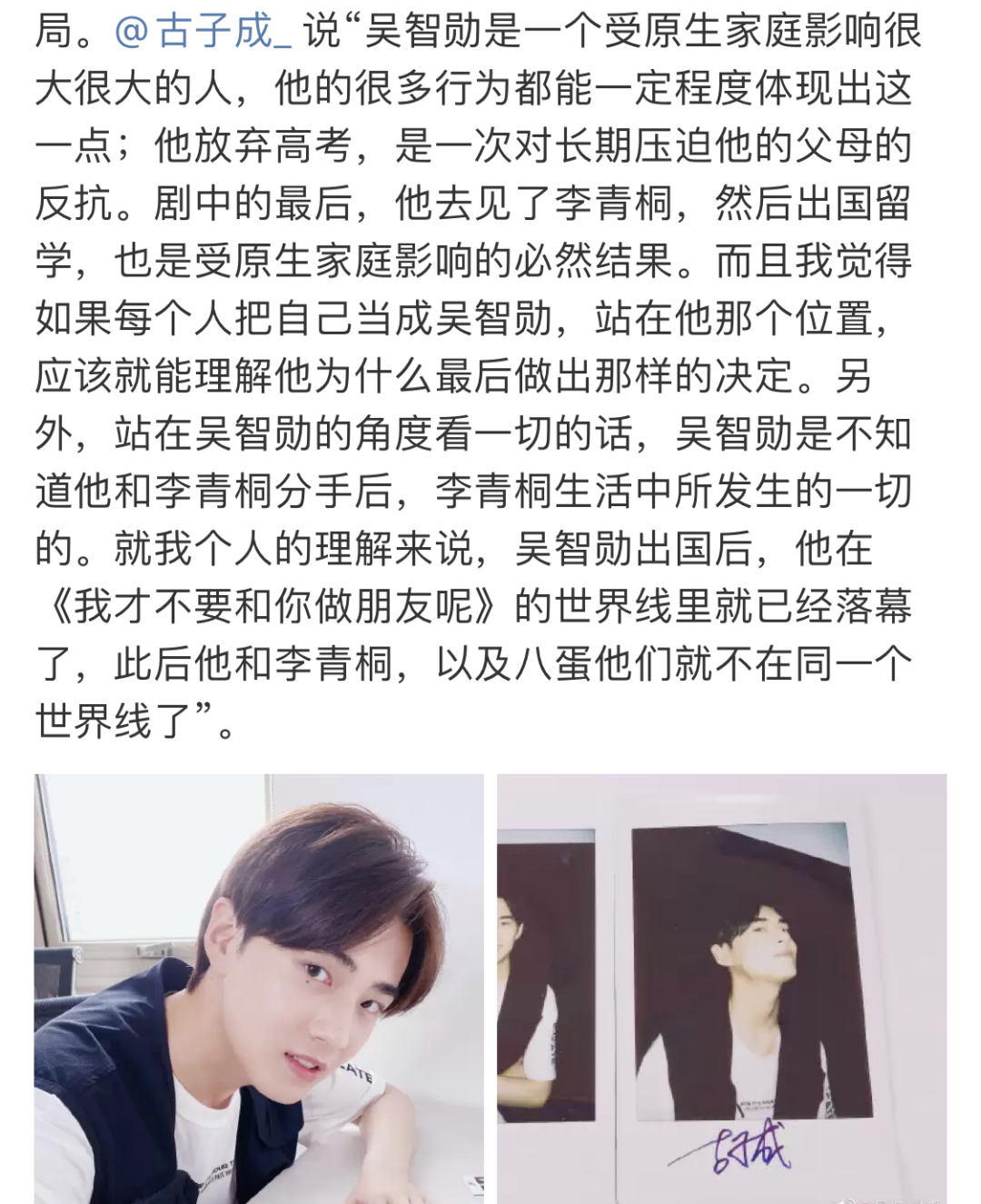 古子成+吴智勋,《我才不要和你做朋友呢》里的光与暗 戏客Seeker 内地男星 2020-06-20 21:02:25 17 创作不易,用心坚持,欢迎请BaGua喝几杯爱心咖啡!打赏并支持本文 打赏并删除本文 这个初夏还有没为了《我才不要和你做朋友呢》尖叫的朋友吗?应该不少人都是像我一样,前半程高喊“父母爱情就是坠吊的”,后半程为学霸的“反击”助威“吴智勋真有你的”吧?(↑这个花絮毫不夸张我还可以再嗑N个来回)虽然看到结局时不免为父母爱情line有些伤感,可也正是因为结局时的这些曲折,让我很想聊聊古子成扮演的吴智勋这个角色。吴智勋这个角色一开始被大家入股的理由就是那份属于学霸的限定情深。明明出场设定是不食学渣烟火、更不懂课余风情的冰山学霸,任何会打扰到他学习的人事物都不可以近他身、入他眼。可很快,学霸的反转开始陆续上演。他是想要学打篮球,想要和同学们一样在运动会上挥洒汗水和青春的。他也并不是冷着脸不肯给李青桐补课的人。嘴上说着不会浪费这个时间给大家都补课,但还是乖乖拿着书本来到了小黑板前。说着跑进前三才有奖励,但即使李青桐成绩作废,他还是送了她最想要的王力宏新专辑。吴智勋这个角色开始在古子成的诠释下,变得有了更多生动的人物皱褶。他会摘下眼镜在球场上活跃,也会暗藏着自己的感情写下那满满一本李青桐专属复习笔记,甚至也会反抗父母,他开始有了青春期男孩子们应该有的情绪。只知道阅读课本和辅导书的他,产生了一些超纲的青春懵懂。一边听着李青桐背诵复习笔记,一边噙着笑为她撑伞的时刻,成了不少人入股父母爱情的心动名场面。也许有人觉得他活得有些呆板,不够肆意,可在古子成的诠释下,吴智勋的苏点恰到好处地体现在了他介乎心动和理智间的摇摆。从中学时代那些图书馆里渐渐拉近的距离,到大学时期偶尔的浪漫,他不是一个24孝式的男友,可正是因为了解此前的他是怎样的人,才会知道他在告白时说出的那句“这都是因为你(李青桐),因为你改变了我”的重量。这些“我的眼里从此多了一个你”的细节,是让吴智勋从冷山学霸变苏点男孩的理由。而更重要的是,这些看似不显眼,但一直在暗暗流露的心意,就是父母爱情line双箭头的证明啊。嘴硬心软地去医院探望她,不知道怎么表达就只好说你想吃什么我来买,和她坚定地组成学习小组不肯变,为她有了人生第一次打架、第一次罚站、第一次反抗父母,谁说吴智勋冷山系没有爱的回弹,一路走过来,他都有用自己的方式说着“我也喜欢你”啊。当然,到吴智勋选择出国留学后,后期的父母爱情糖开始变得不那么香了。可大家还是忍不住被学霸的壁咚吻苏到尖叫,忍不住为他最终的那句“我会记住我们的过去,但我希望你忘掉它”神伤。究其原因,我想就是我们能够理解他吧。当父母变卖房子、委屈自己,只为了全他一个出路时,他身上背着的,就不再只是吴智勋一个人的理想了。他的选择背后牵涉的不是关于前途和爱情的抉择,而是毫无退路,只能带着父母的所有期待和希望前行。正如古子成接受采访时说的那样,吴智勋的人生道路上,有太多选择是受原生家庭影响而做出的,他有着他无法挣脱的不得已。“吴智勋出国后,他在《我才不要和你做朋友呢》的世界线里就已经落幕了”,这句话让人好伤感。可也正是因为对吴智勋这个角色有着这样清醒的认知,才让古子成在诠释中为他注入了更多丰满的细节。那些不经意的眼神在意,偶尔做出的浪漫言行,都是这个角色在呆板和鲜活中一呼一吸的最佳注解。而且,都说眼镜会封印颜值,但一边学习不易小吴叹气着,一边也没耽误这位学霸释放颜值杀啊!(必须来一个爱的眼神三连!)能够初触荧屏就碰到这样一个精彩的剧本和考验演技可能性的角色,我想对演员古子成来说是件幸事。四月份时开心地庆祝着生日的他,也许没有想过夏天来临时,自己的第一部作品成了当季爆款青春。可以看出他对这个角色和整个剧组的感情,不仅是写着真情实感小作文话别,更是从拍摄后就时常回忆的存在。但我想未来他一定也会带着同样的投入,不断创造出新的角色吧。半个月前在横店杀青的古装爱情剧《玉昭令》中,他与官鸿联手担纲主演,出演了原著小说中的那位瀛洲小仙温孤苇余。本是蓬莱惊才绝艳的仙君,冷感禁欲,心思缜密。可也有着对端木翠独一无二的深情,那份因占有欲、安全感而生的宁负天下也不负你的偏执,是这个角色的一大亮点。刚刚官宣并开机的近代传奇剧《光芒》里,他和张新成、蔡文静一起出演。在剧中饰演了创办了建筑公司的高才建筑师徐树,这是一个有着近乎理想主义的赤忱纯真的角色,在人人想缔造华厦摇身变成阔绰老板的时候,他只想为百姓造出实用宜居的住所。从心怀理想的谦谦君子,到一步步践行出梦想之路的之人,无论在事业和爱情上,他都有着那一份不变的美好希冀。接连出演的三个角色都有着截然不同的性格特性,相信在几种模式中不断跳跃进阶的演员古子成,会很快收获更多的成长和可能。虽然2019年才入学上戏,作为演员还处在刚刚崭露头角的阶段,但可以看出古子成对于表演、对于作品,有着自己的诚恳和热忱。不仅在于拍前的充分准备、参悟角色,以及片场的种种积极表现,让大家觉得温暖的是,他会认真地去跟进观众反馈。看到大家的真实评论后,也会真诚地给予