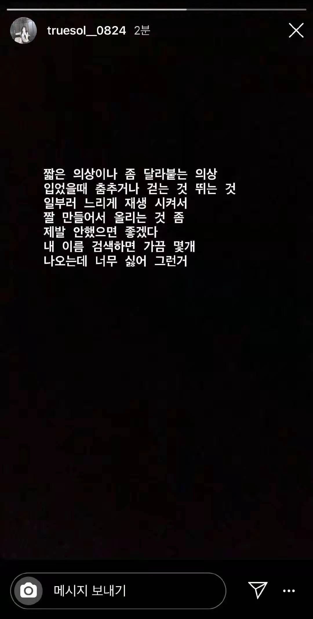 今天,April成员李真率发了个Instastory:“不要再把我穿短衣服和紧身衣服跳舞或走路时的动作故意放慢做成动图了 网上搜我的名字时偶尔会看到几个 非常讨厌这样”