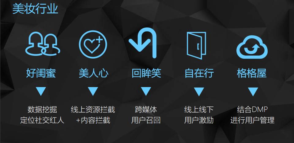 Action除了针对痛点的模型,还提供了许多功能化的模块,比如通过数据挖掘,定位社交红人的“好闺蜜”能够放大网红对女性消费者的影响力;“美人心”则是顾客对竞品摇摆不定时,进行竞品的拦截;“回眸笑”则是跨媒体的重定向服务,把流失的客户有效召回。